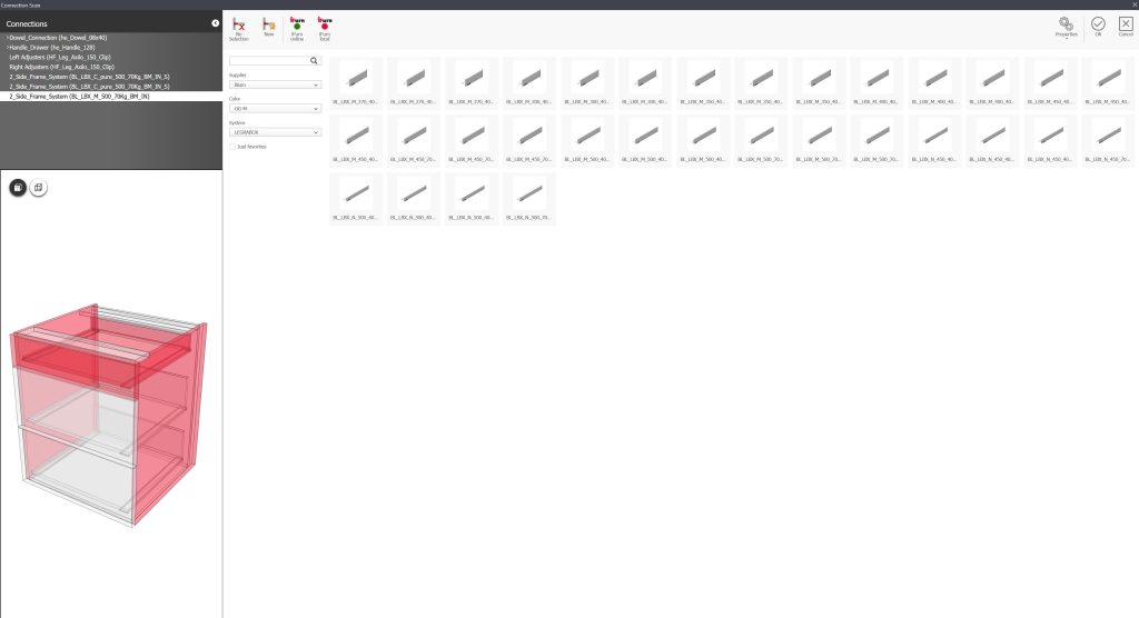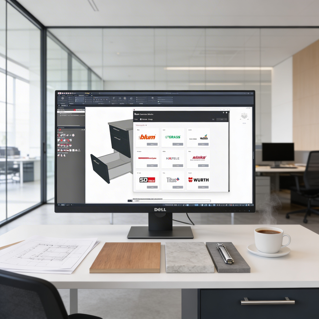 iFurn is your direct link to a vast library of digital product data from leading hardware and material suppliers. From hinges and drawer systems to sliding door fittings and surface materials, every item comes with everything you need.